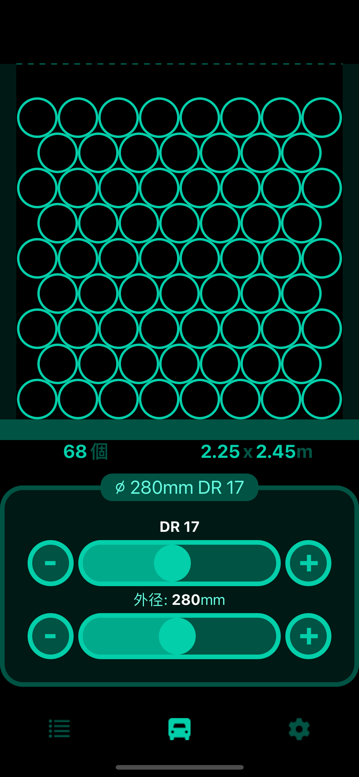 車両の寸法と管径に基づき、積載可能な管の本数を計算。物流を最適化し、輸送コストを削減。メートル法とヤード・ポンド法の単位をサポート。