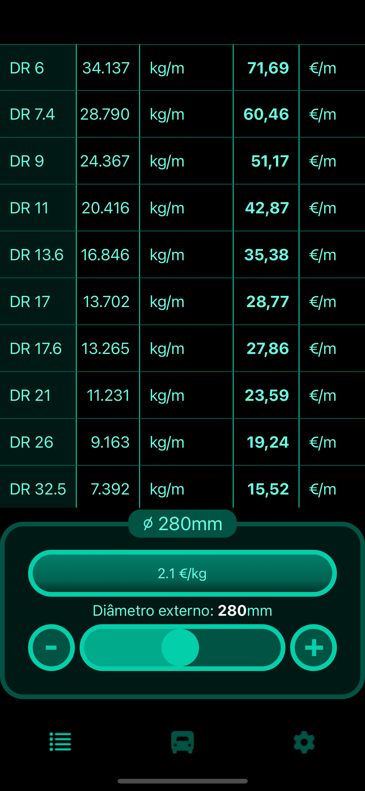 Converta os custos do tubo de preço por quilograma (ou libra) para preço por metro linear (ou pé) – ideal para gerar rapidamente estimativas e propostas comerciais em qualquer moeda.